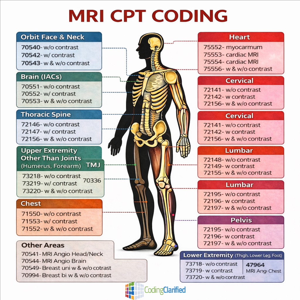 Coding for MRI procedures involves several key components that influence the selection of CPT codes: