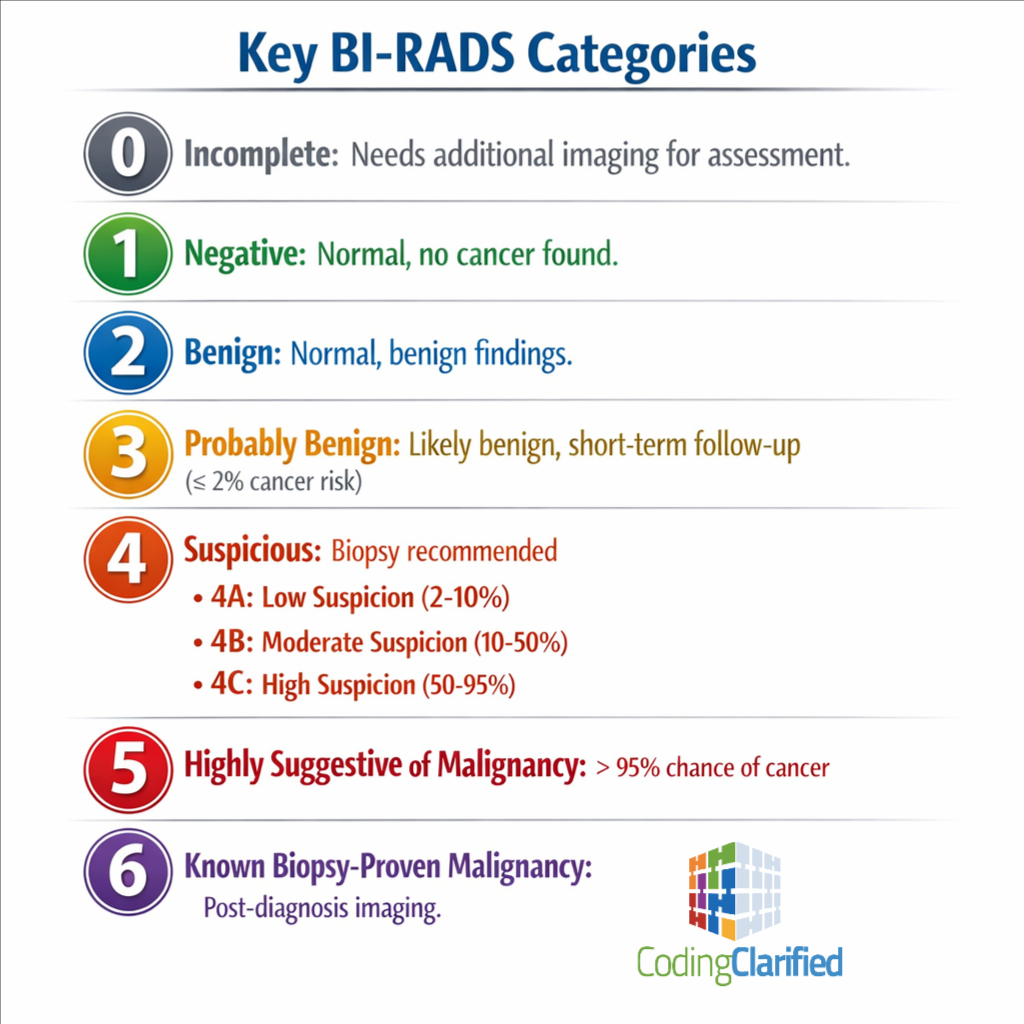 | BI-RADS | 0 | Incomplete – additional imaging needed |
