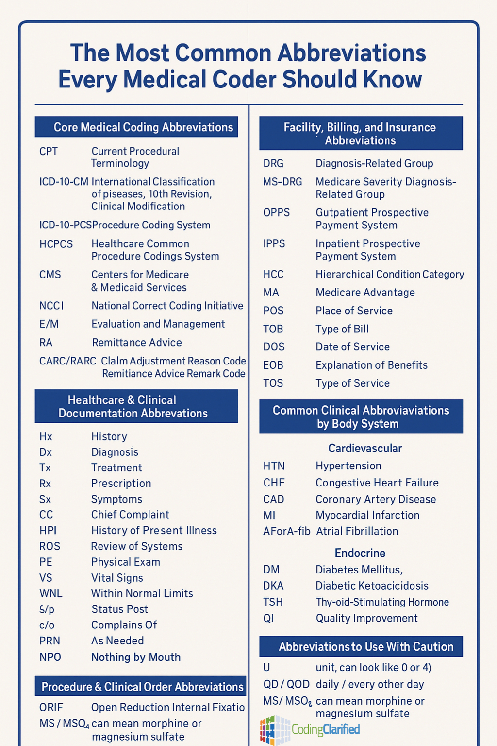 Below is a streamlined guide to the most common abbreviations every medical coder should know, organized by category for easy study and real-world use.